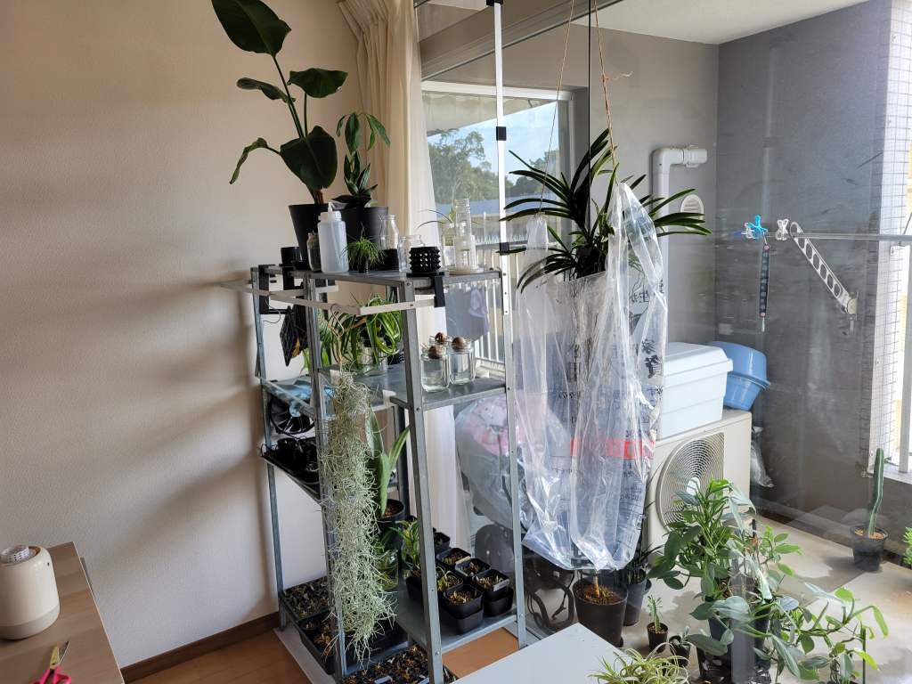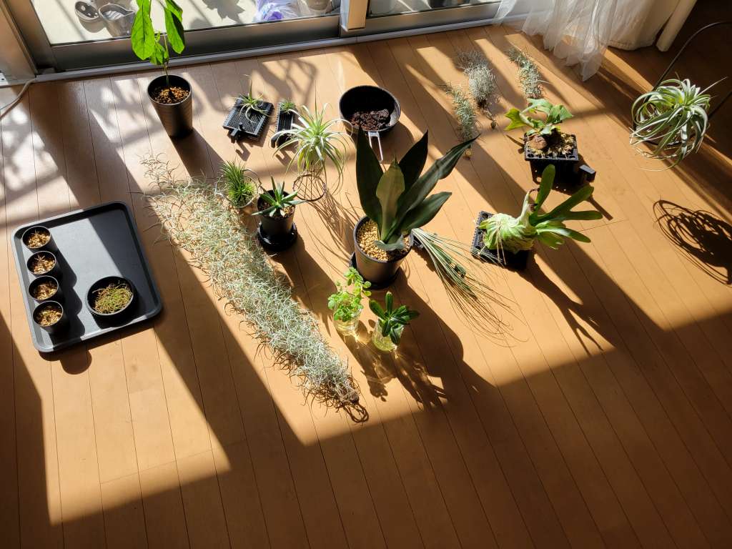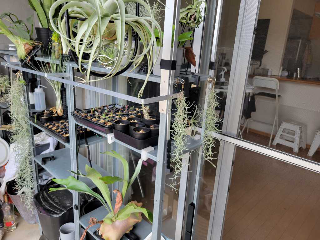 スパニッシュモスは-5度くらいまで大丈夫なようなので、室内に入れる必要はなさそうですが、この時は旅行前だったので、入れておきました。(バンダはゴミ袋の下に水を入れてちょっと根をつけるようにして10日ほど水やりしなくても無事でした。)