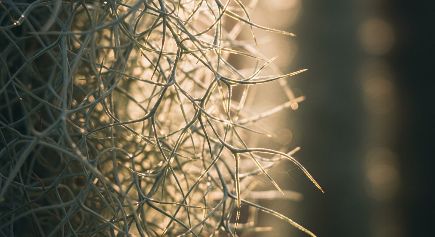 スパニッシュモスは、細長い茎と葉を持ち、通常は木の枝から垂れ下がるように成長します。葉は2〜6cmの長さで、灰緑色から銀色の外観を持ち、最大で6mまで成長することがあります。根を持たず、空気中の水分や栄養を葉から吸収するエピフィト(着生植物)です。